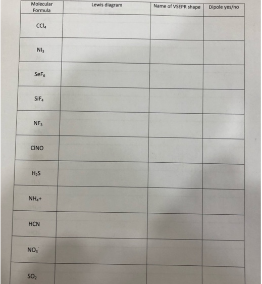 Molecular Lewis diagram Name of VSEPR shape Dipole yes/no Formula SeFs SiF. NF3 ÇINO H;S NHạ+ HCN NO,