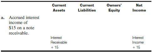 Current Current Owners' Net Assets Liabilities Equity Income a. Accrued interest income of $15 on a note receivable. Interest Interest Receivable Income + 15 + 15