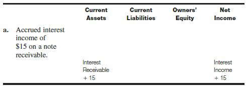 Current Current Owners' Net Assets Liabilitios Equity Income a. Accrued interest income of $15 on a note receivable. Interest Interest Receivable Income + 15 + 15