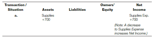 Transaction / Owners' Net Situation Assets Liabilities Equity Income Supplies +700 Supplies Exp. +700 a. (Note: A decrease to Supplies Expense increases Net Income.)