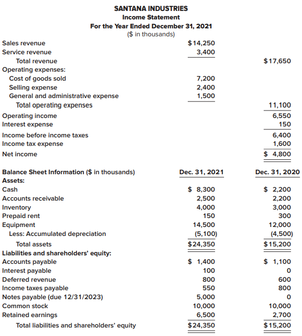 Presented below are the 2021 income statement and comparative balance sheets for Santana Industries.
