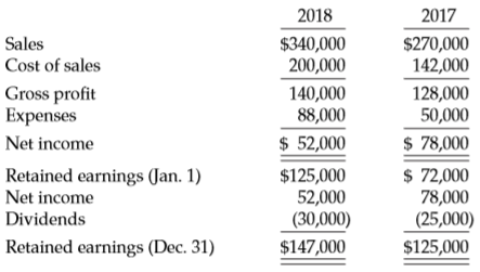 2018 2017 Sales Cost of sales $340,000 200,000 $270,000 142,000 Gross profit Expenses 140,000 88,000 $ 52,000 128,000 50,000 Net income $ 78,000 Retained earnings (Jan. 1) Net income $125,000 52,000 $ 72,000 78,000 (25,000) Dividends (30,000) Retained earnings (Dec. 31) $147,000 $125,000