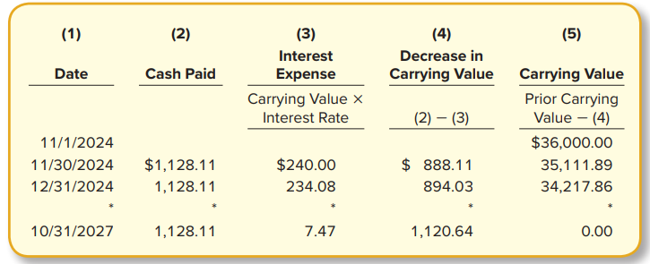 Presented below is a partial amortization schedule for a three-year installment note requiring monthly payments of $1,128.11.