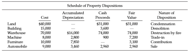 Schedule of Property Dispositions Fair Value Accumulated Cash Nature of Cost Depreciation Proceeds Disposition Land $40,000 15,000 70,000 8,000 10,000 9,000 $31,000 3,600 74,000 $31,000 Condemnation Building Warehouse Demolition Destruction by fire Trade-in $16,000 2,800 7,850 3,460 74,000 7,200 3,100 2,960 Sale Machine 900 Furniture Contribution Automobile 2,960