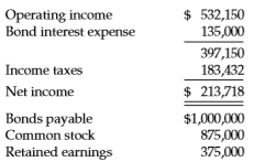 Operating Income Bond interest expense $ 532,150 135,000 397,150 183,432 Income taxes Net income $ 213,718 Bonds payable Common stock Retained earnings $1,000,000 875,000 375,000