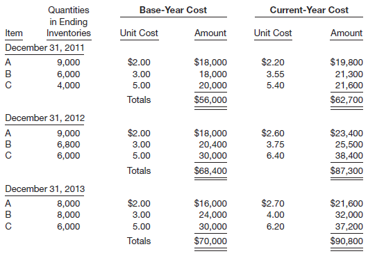 Quantities Base-Year Cost Current-Year Cost in Ending Inventories Item Unit Cost Amount Unit Cost Amount December 31, 2011 $2.00 $18,000 $2.20 $19,800 21,300 21,600 9,000 6,000 4,000 3.00 18,000 20,000 3.55 5.00 5.40 Totals $56,000 $62,700 December 31, 2012 $2.00 3.00 5.00 $18,000 20,400 30,000 A $2.60 $23,400 9,000 6,800 6,000 B 3.75 25,500 38,400 6.40 Totals $68,400 $87,300 December 31, 2013 A $2.00 $16,000 $2.70 $21,600 8,000 8,000 B 3.00 24,000 4.00 32,000 6,000 5.00 30,000 6.20 37,200 Totals $70,000 $90,800 |ABC