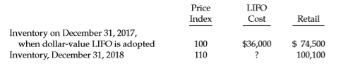Price LIFO Index Cost Retail Inventory on December 31, 2017, when dollar-value LIFO is adopted Inventory, December 31, 2018 $ 74,500 100,100 100 $36,000 110