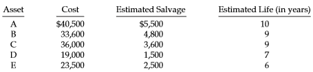 Asset Cost Estimated Salvage Estimated Life (in years) $5,500 4,800 3,600 1,500 2,500 A В $40,500 33,600 36,000 19,000 23,500 10 9 7 E 6