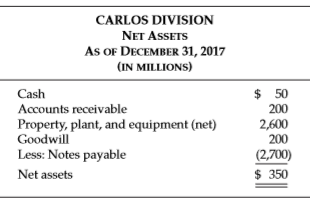 CARLOS DIVISION NET ASSETS As OF DECEMBER 31, 2017 (IN MILLIONS) Cash $ 50 Accounts receivable 200 Property, plant, and equipment (net) Goodwill Less: Notes payable 2,600 200 (2,700) Net assets $ 350