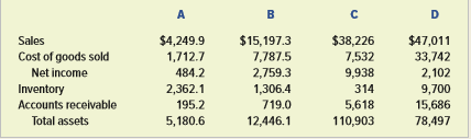 A B D $4,249.9 1,712.7 $15,197.3 7,787.5 2,759.3 $38,226 7,532 9,938 $47,011 33,742 2,102 Sales Cost of goods sold Net income 484.2 Inventory Accounts receivable 2,362.1 1,306.4 719.0 314 9,700 195.2 5,618 110,903 15,686 78,497 Total assets 5,180.6 12,446.1