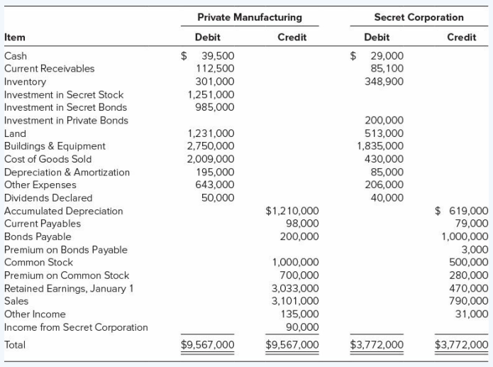 Private Manufacturing Secret Corporation Item Debit Credit Debit Credit $ 39,500 $ 29,000 85,100 348,900 Cash Current Receivables Inventory Investment in Secret Stock Investment in Secret Bonds 112,500 301,000 1,251,000 985,000 Investment in Private Bonds 200,000 513,000 1,835,000 430,000 85,000 206,000 Land 1,231,000 2,750,000 2,009,000 195,000 643,000 Buildings & Equipment Cost of Goods Sold Depreciation & Amortization Other Expenses Dividends Declared 50,000 40,000 Accumulated Depreciation Current Payables Bonds Payable Premium on Bonds Payable $ 619,000 79,000 1,000,000 3,000 500,000 280,000 $1,210,000 98,000 200,000 Common Stock 1,000,000 700,000 3,033,000 3,101,000 135,000 Premium on Common Stock Retained Earnings, January 1 Sales 470,000 790,000 Other Income 31,000 Income from Secret Corporation 90,000 Total $9,567,000 $9,567,000 $3,772,000 $3,772,000