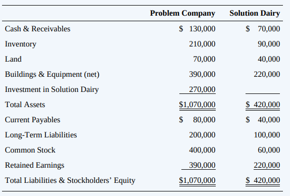 Problem Company Solution Dairy Cash & Receivables $ 130,000 $ 70,000 Inventory 210,000 90,000 Land 70,000 40,000 Buildings & Equipment (net) 390,000 220,000 Investment in Solution Dairy 270,000 Total Assets $1,070,000 $ 420,000 Current Payables $ 80,000 $ 40,000 Long-Term Liabilities 200,000 100,000 Common Stock 400,000 60,000 Retained Earnings 390,000 220,000 Total Liabilities & Stockholders' Equity $1,070,000 $ 420,000