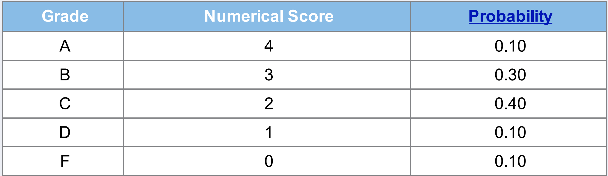 Grade Numerical Score Probability A 4 0.10 В 0.30 C 0.40 D 1 0.10 F 0.10