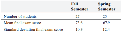 Professor Stephen Zuro of Joliet Junior College wanted to determine whether an online homework system (meaning students did homework online and received instant feedback with helpful guidance about their answers) improved scores on a final exam. In the fall semester, he taught a precalculus class using an online homework system. In the spring semester, he taught a precalculus class without the homework system (which meant students were responsible for doing their homework the old-fashioned way—paper and pencil). Professor Zuro made sure to teach the two courses identically (same text, syllabus, tests, meeting time, meeting location, and so on). The table summarizes the results of the two classes on their final exam.