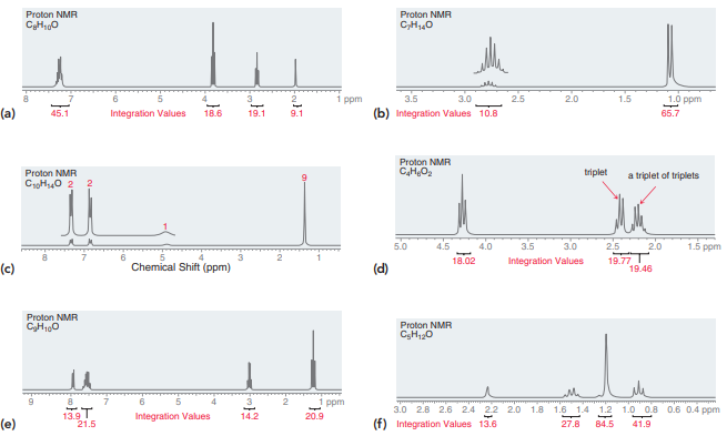 Proton NMR Proton NMR C,H,0 1 ppm 3.5 3.0 2.0 1.5 1.0 ppm (a) 45.1 Integration Values 18.6 19.1 9.1 (b) Integration Values 10.8 65.7 Proton NMR Proton NMR CH,O2 triplet a triplet of triplets CroH0 2 4.0 3.5 3.0 2.5 2.0 1.5 ppm 19.77 19.46 18.02 Integration Values (c) Chemical Shift (ppm) (d) Proton NMR CH10 Proton NMR 7 6 5 ppm 3.0 2.8 2.6 2.4 2.2 2.0 1.8 1.6 1.4 1.2 1.0 0.8 0.6 0.4 ppm 139T Integration Values 14.2 20.9 (e) 21.5 (f) Integration Values 13.6 27.8 84.5 41.9