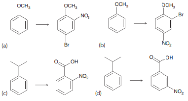 > Starting with benzene and using any other reagents of your choice, design a synthesis for each of the following compounds. In some cases, there may be more than one plausible answer. OMe COOH Br- Br NO2 Rr (a) NO2 (b) COOH (c) NO2 OEt COOH NO, .CI NO