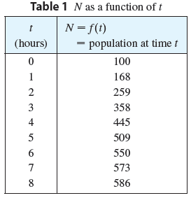 Table 1 N as a function of t N=f(t) = population at time t || (hours) 100 1 168 2 259 3 358 4 445 5 509 550 7 573 8 586