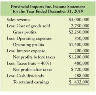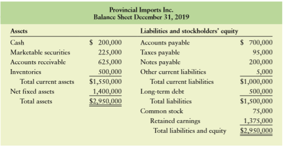 Provincial Imports Inc. Income Statement for the Year Ended December 31, 2019 Sales revenue Less: Cost of goods sold Gross profits Less: Operating expenses Operating profits Less: Interest expense $5,000,000 2,750,000 $2,250,000 850,000 $1,400,000 200,000 $1,200,000 480,000 $ 720,000 Net profits before taxes Less: Taxes (rate = 40%) Net profits after taxes Less: Cash dividends 288,000 $ 432,000 To retained earnings Provincial Imports Inc. Balance Sheet December 31, 2019 Liabilities and stockholders’ equity Assets $ 200,000 $ 700,000 95,000 Cash Accounts payable Taxes payable Notes payable Marketable securities 225,000 Accounts reccivable 625,000 200,000 Inventories 500,000 Other current liabilitics 5,000 $1,000,000 500,000 $1,500,000 Total current assets $1,550,000 Total current liabilities Net fixed assets Long-term debt 1,400,000 $2,950,000 Total assets Total liabilitics Common stock 75,000 Retained carnings Total liabilities and cquity 1,375,000 $2,950,000