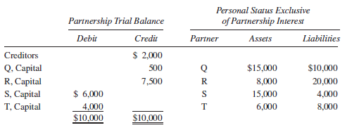 Personal Status Exclusive Partnership Trial Balance of Partnership Interest Debit Credit Partner Assets Liabilities Creditors $ 2,000 Q. Capital R, Capital S, Capital Т, Сарital 500 Q $15,000 $10,000 7,500 R. 8,000 20,000 $ 6,000 15,000 4,000 4,000 T 6,000 8,000 $10,000 $10,000