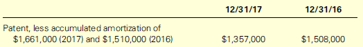 Quickster Inc. acquired a patent a number of years ago. The patent is being amortized on a straight-line basis over its estimated useful life. The companyâs comparative balance sheets as of December 31, 2017 and 2016, included the following line item: