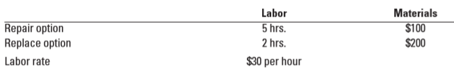 Labor Materials 5 hrs. Repair option Replace option $100 2 hrs. $200 Labor rate $30 per hour