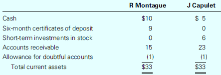 R Montague J Capulet Cash $10 $ 5 Six-month certificates of deposit 9 Short-term investments in stock 6 Accounts receivable 15 23 Allowance for doubtful accounts (1) (1) Total current assets $33 $33