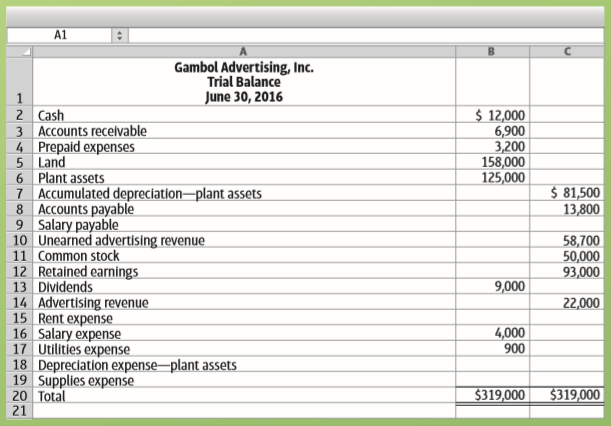 A1 Gambol Advertising, Inc. Trial Balance June 30, 2016 1 2 Cash 3 Accounts recelvable 4 Prepaid expenses 5 Land 6 Plant assets 7 Accumulated depreciation–plant assets 8 Accounts payable 9 Salary payable 10 Unearned advertising revenue 11 Common stock 12 Retained earnings 13 Dividends 14 Advertising revenue 15 Rent expense 16 Salary expense 17 Utilities expense 18 depreciation expense–plant assets 19 Supplies expense 20 Total 21 $ 12,000 6,900 3,200 158,000 125,000 $ 81,500 13,800 58,700 50,000 93,000 9,000 22,000 4,000 900 $319,000 $319,000
