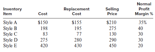 Ramps by Jake, Inc., manufactures skateboard ramps. The company uses independent sales representatives to market its products and pays a commission of 8% on each sale. Data regarding the five styles of ramps in the companyâs inventory at December 31, 20X1, follow. The normal profit margin on each style is expressed as a percentage of the itemâs selling price. Jake has multiple units of each style and uses the LIFO cost flow assumption.