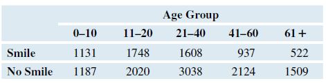![Randomly chosen people were observed for about 10 seconds in several public places, such as malls and restaurants, to see whether they smiled during that time. The table shows the results for different age groups.