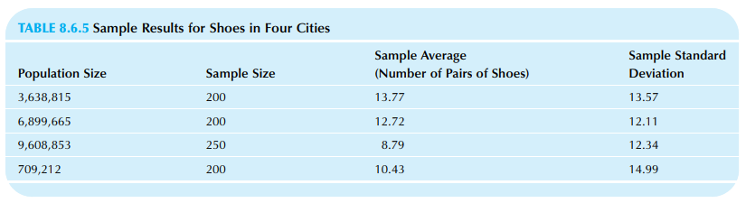 TABLE 8.6.5 Sample Results for Shoes in Four Cities Sample Average (Number of Pairs of Shoes) Sample Standard Population Size Sample Size Deviation 3,638,815 200 13.77 13.57 6,899,665 200 12.72 12.11 9,608,853 250 8.79 12.34 709,212 200 10.43 14.99