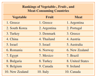 > Rankings of Countries In Exercises 15–20, use the following table, which shows the top 10 countries for per person consumption of vegetables, fruit, and meat. The universal set is the set of countries in the world Greece