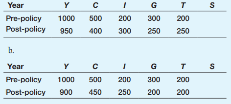 > It is often argued that a balanced budget amendment would actually be destabilizing. To understand this argument, consider the economy in Problem 5. a. Solve for equilibrium output. b. Solve for taxes in equilibrium. Suppose that the government starts wi
