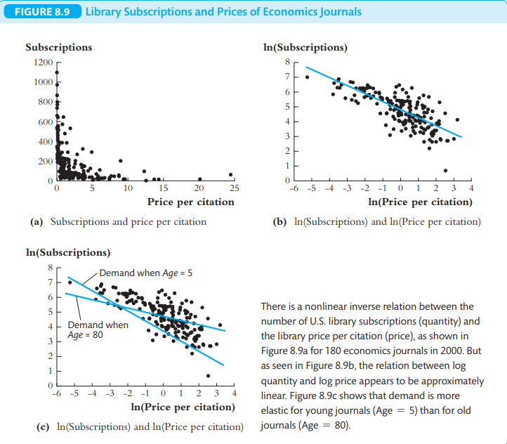 Accordingly, we measure price as the âprice per citationâ in the journal. The price range is enormous, from 1/2¢ per citation (the American Economic Review) to 20¢ per citation or more. Some journals are expensive per citation because they have few citations and others because their library subscription price per year is very high. In 2017, a library print subscription to the Journal of Econometrics cost $5363, compared to only $940 for a bundled subscription to all eight journals published by the American Economic Association, including the American Economic Review! Because we are interested in estimating elasticities, we use a log-log specification (Key Concept 8.2). The scatterplots in Figures 8.9a and 8.9b provide empirical support for this transformation.
