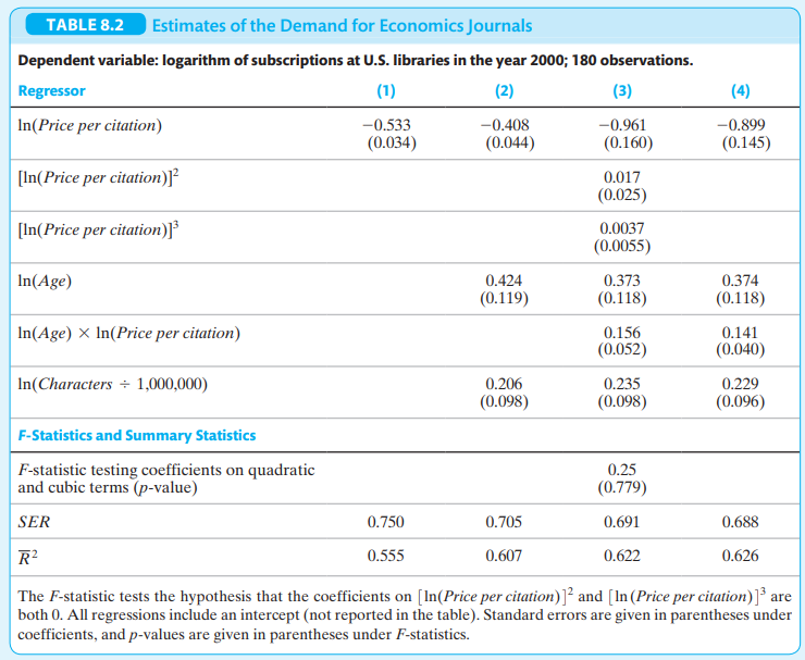 > Read the box “The Demand for Economics Journals” in Section 8.3. a. The box reaches three conclusions. Looking at the results in the table, what is the basis for each of these conclusions? b. Using the results in regre