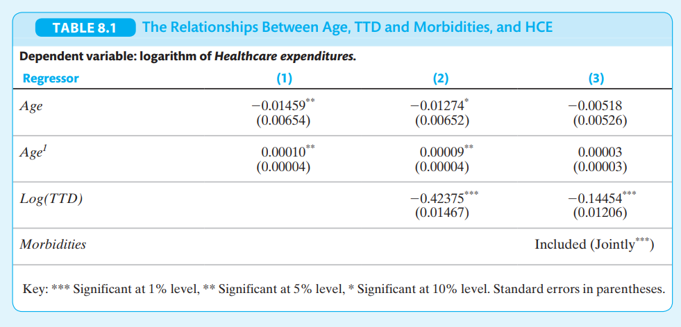 What happens when we include (the log of) TTD? We observe in column (2) that the age and age1 coefficients fall in absolute terms, there is a reduction in statistical significance attached to these coefficients, and that log(TTD) is highly significant in explaining log(HCE). This suggests that TTD is indeed an omitted variable in this regression. Since both of these variables are logtransformed, our results suggest that being 1% further away from death (a 1% increase in TTD) is associated with an average decrease in HCE of around 0.42%. But is this the end of the story? Further research has pointed to TTD itself as a âred herring,â with TTD itself merely proxying for individual morbidity. Measures of morbidity, under this logic, would be an omitted variable in such regressionsâand this would be important in predicting future HCE if people not only age more healthily, but approach death more healthily!