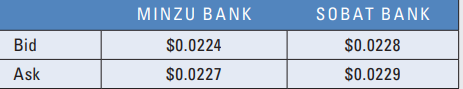 1. The first arbitrage opportunity relates to locational arbitrage. Holt has obtained spot rate quotations from two banks in Thailand: Minzu Bank and Sobat Bank, both located in Bangkok. The bid and ask prices of Thai baht for each bank are displayed in the following table: