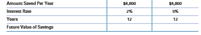 Amount Saved Per Year $3,600 $3,600 Interest Rate 2% 5% Years 12 12 Future Value of Savings Amount Saved Per Year $4,800 $4,800 Inrerest Rate 2% 5% Years 12 12 Future Value of Savings