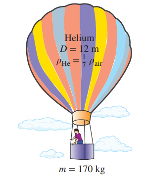 Balloons are often filled with helium gas because it weighs only about one-seventh of what air weighs under identical conditions. The buoyancy force, which can be expressed as Fb = ÏairgVballoon, will push the balloon upward. If the balloon has a diameter of 12 m and carries two people, 85 kg each, determine the acceleration of the balloon when it is first released. Assume the density of air is Ï = 1.16 kg/m3, and neglect the weight of the ropes and the cage.
