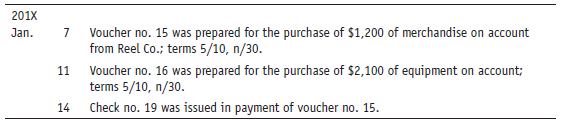 201X Voucher no. 15 was prepared for the purchase of $1,200 of merchandise on account from Reel Co.; terms 5/10, n/30. Jan. 7 Voucher no. 16 was prepared for the purchase of $2,100 of equipment on account; terms 5/10, n/30. 11 14 Check no. 19 was issued in payment of voucher no. 15.