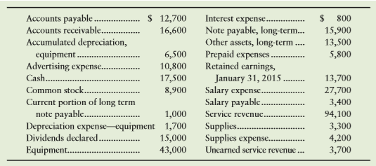 > The accounts of Spa View Service, Inc., at January 31, 2016, are listed in alphabetical order. Requirements 1. All adjustments have been journalized and posted, but the closing entries have not yet been made. Journalize Spa View’s clo