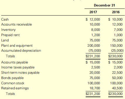 December 31 2017 2016 Cash $ 12,000 $ 10,000 Accounts receivable 10,000 12,000 Inventory Prepaid rent 8,000 7,000 1,200 1,000 Land 75,000 75,000 Plant and equipment 200,000 150,000 Accumulated depreciation (75,000) (25,000) Totals $231,200 $230,000 $ 15,000 $ 15,000 2,000 Accounts payable Income taxes payable Short-term notes payable Bonds payable 2,500 20,000 22,500 75,000 50,000 Common stock 100,000 100,000 Retained eamings 18,700 40,500 Totals $231,200 $230,000