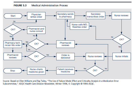 Suppose that a hospital wants to design a process for administering medication to a patient. Clearly, the last subprocess is âpatient receives medicine.â The input to this subprocess is âmedicine is delivered from the pharmacy.â Working backwards, we identify the previous subprocess as âpharmacy fills prescription orderâ and âphysician writes order.â We may then expand each subprocess to create a more detailed process description that includes checks and reviews and more detailed steps. Figure 5.3 shows how this design might end up.