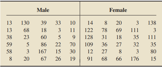 Data from Exercise 10.46: In the paper “The Relation of Sex and Sense of Direction to Spatial Orientation in an Unfamiliar Environment” (Journal of Environmental Psychology, Vol. 20, pp. 17–28), J. Sholl et al. published the results of examining the sense of direction of 30 male and 30 female students. After being taken to an unfamiliar wooded park, the students were given some spatial orientation tests, including pointing to south, which tested their absolute frame of reference. The students pointed by moving a pointer attached to a 360◦ protractor. Following are the absolute pointing errors, in degrees, of the participants.