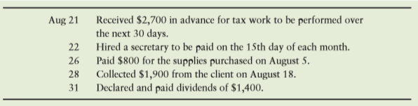 Received $2,700 in advance for tax work to be performed over the next 30 days. Hired a secretary to be paid on the 15Sth day of each month. Paid $800 for the supplies purchased on August 5. Collected $1,900 from the client on August 18. Declared and paid dividends of $1,400. Aug 21 22 26 28 31