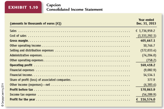 Refer to Exhibit 1.10, which contains income statement information that is based on the financial report of Capcion, an Austrian paper and packaging manufacturer. Capcion reports all amounts in thousands of euros (â¬). Answer the following questions that pertain to the information in this exhibit.