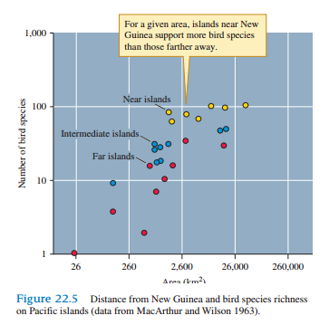 Refer to figure 22.5, which MacArthur and Wilson (1963) used to show how isolation affects species richness on islands. Find a detailed map of the Pacific Ocean and locate New Guinea. Next locate as many of the ânear,â âintermediate,â and âfarâ islands on the map as you can. This will give you a better sense of the distances represented by the islands. How do the numbers of species on near, intermediate, and far islands support the hypothesis that island isolation tends to reduce species richness?
