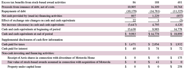 > Samsung’s balance sheet in Appendix A reports the change in cash and equivalents for the year ended December 31, 2013. Identify the cash generated (or used) by operating activities, by investing activities, and by financing (funding) ac