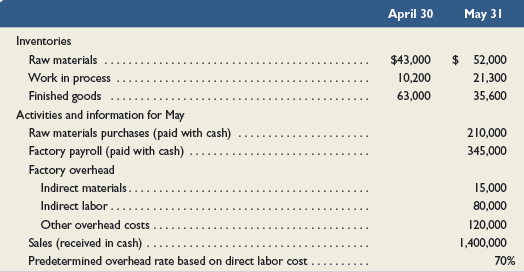 April 30 May 31 Inventories Raw materials $43,000 $ 52,000 10,200 Work in process Finished goods 21,300 63,000 35,600 Activities and information for May Raw materials purchases (paid with cash) Factory payroll (paid with cash) 210,000 345,000 Factory overhead Indirect materials.. 15,000 Indirect labor... 80,000 Other overhead costs 120,000 Sales (received in cash).. 1,400,000 Predetermined overhead rate based on direct labor cost 70%