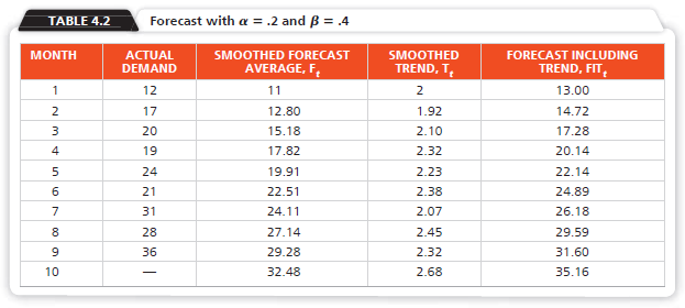 MONTH (f) ACTUAL DEMAND (A) MONTH (t) ACTUAL DEMAND (A) 1 12 6. 21 2 17 7 31 3 20 8 28 4 19 9 36 24 10 Forecast with a =.2 and B = .4 TABLE 4.2 MONTH ACTUAL DEMAND SMOOTHED FORECAST SMOOTHED FORECAST INCLUDING AVERAGE, F, TREND, T, TREND, FIT, 1 12 11 2 13.00 2 17 12.80 1.92 14.72 3 20 15.18 2.10 17.28 4 19 17.82 2.32 20.14 5 24 19.91 2.23 22.14 21 22.51 2.38 24.89 7 31 24.11 2.07 26.18 8. 28 27.14 2.45 29.59 36 29.28 2.32 31.60 10 32.48 2.68 35.16