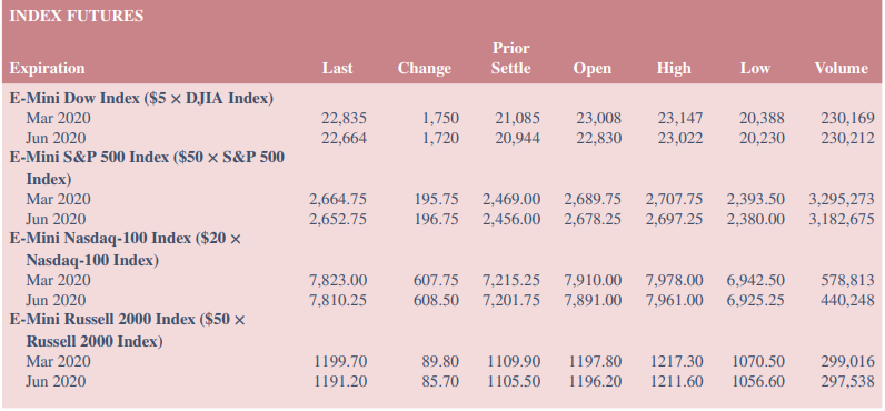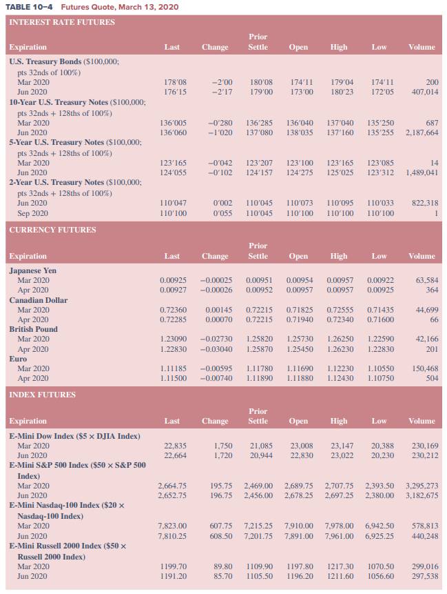 > Refer to Table 10–4. a. What was the settlement price on the September 2020 2-year U.S. Treasury notes futures contract on March 13, 2020? b. How many five-year Treasury note futures contracts traded on March 13, 2020? c. What is the